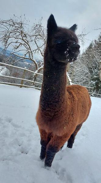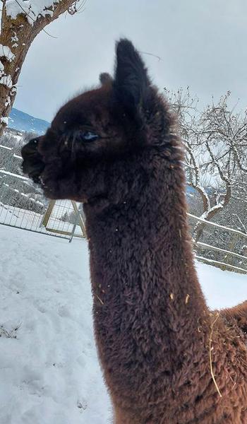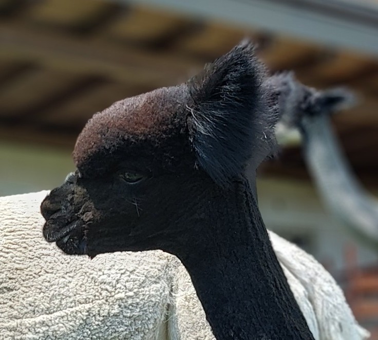Jungstute, sehr schöner Kopf und dichtes, feines Vlies mit 17,4 Micron - eine gelungene Nachzucht und vielversprechende Zuchtstute, die uns besonders zugetan ist.